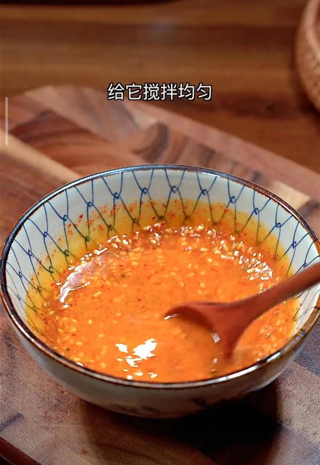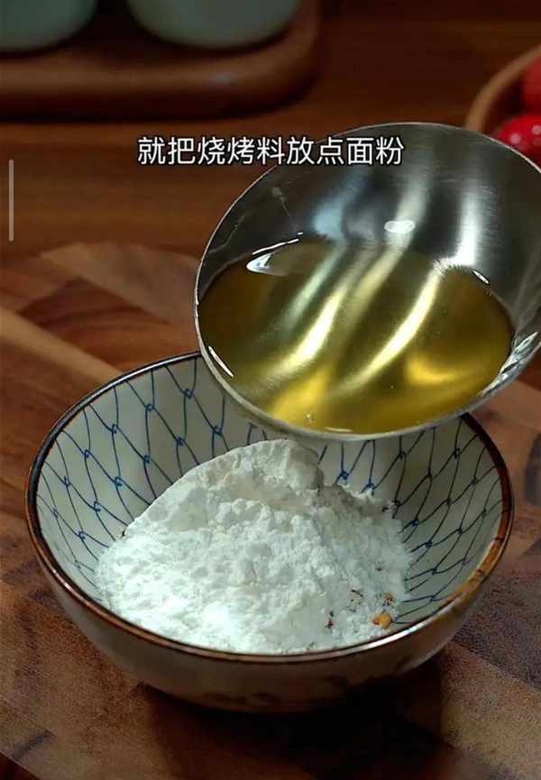 1、現在這個大傢都喜歡吃燒烤,所以我們可以做一個燒烤味的,碗中倒入燒烤料,放入面粉,熱油炸香,攪拌均勻;