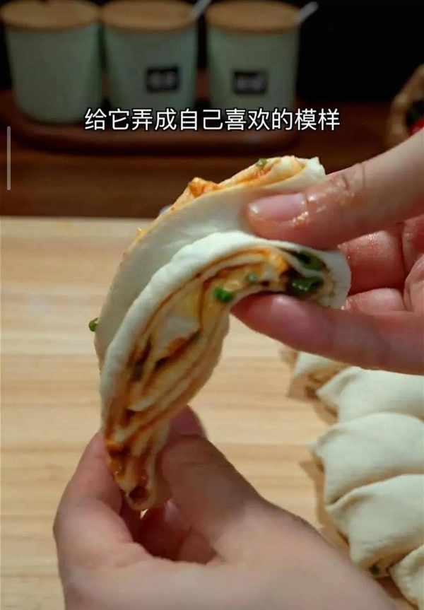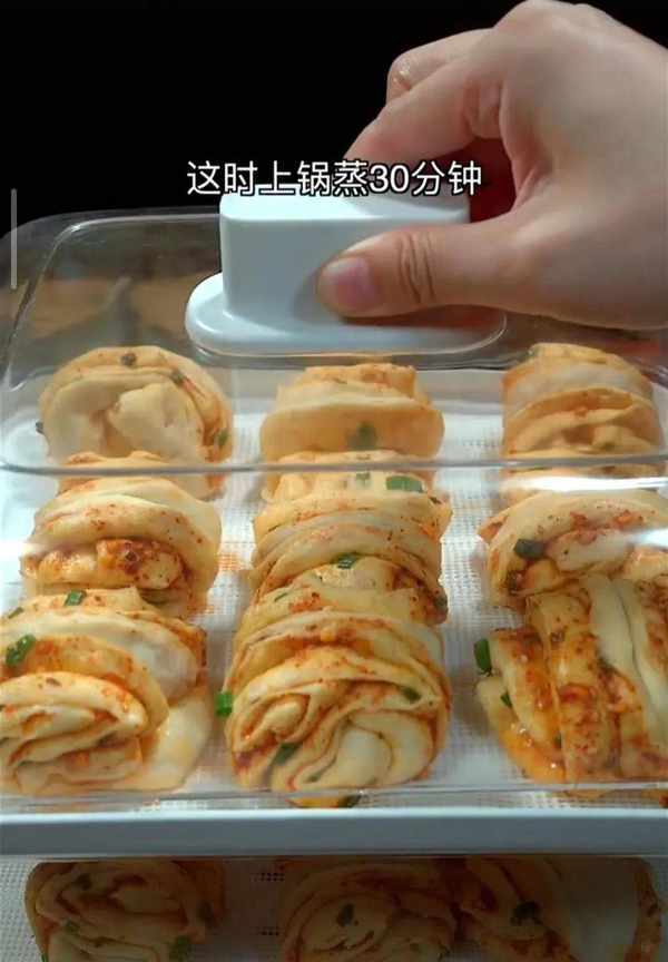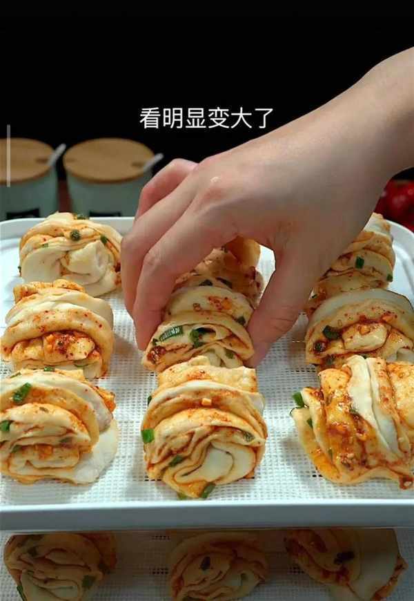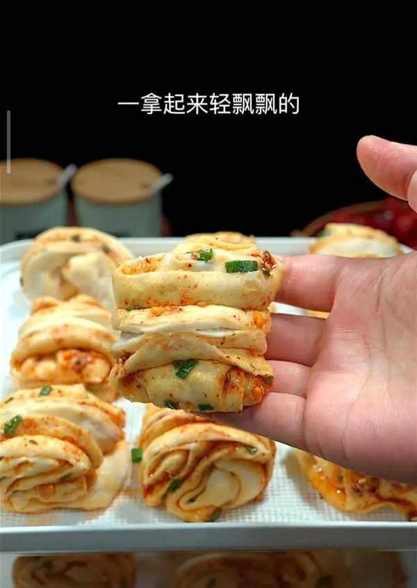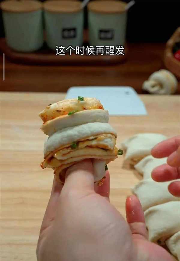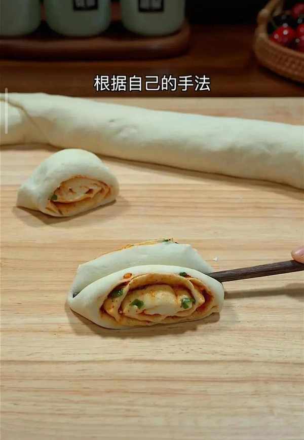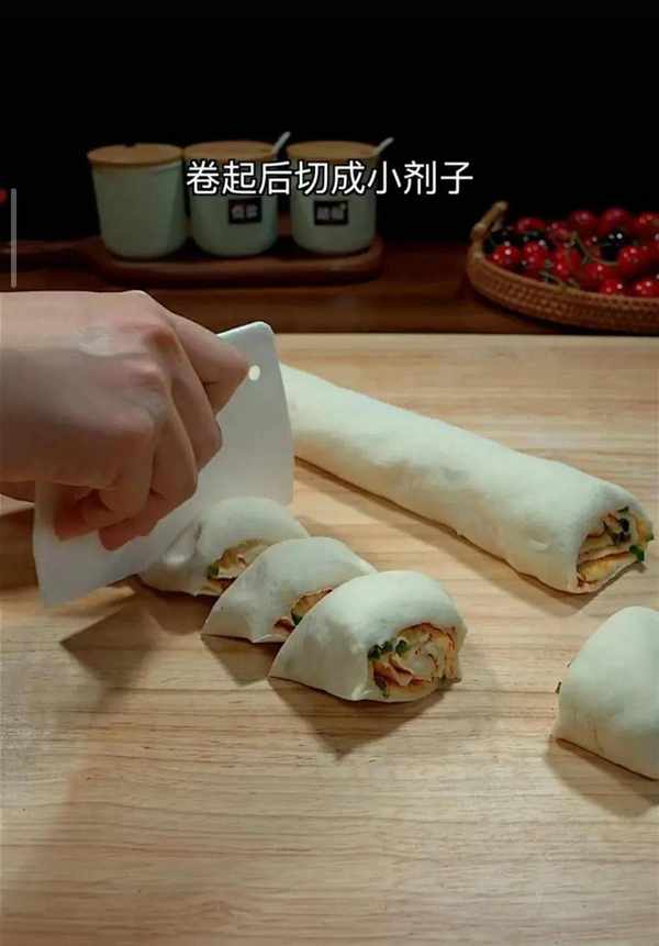 4、上面再撒點小蔥花,卷起來切成小劑子,根據自己的手法,弄成自己喜歡的樣子;
