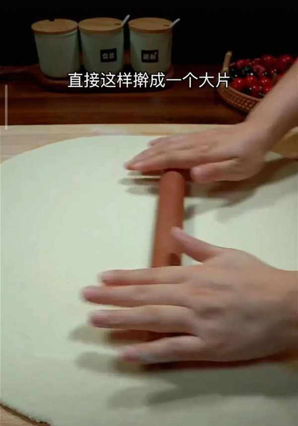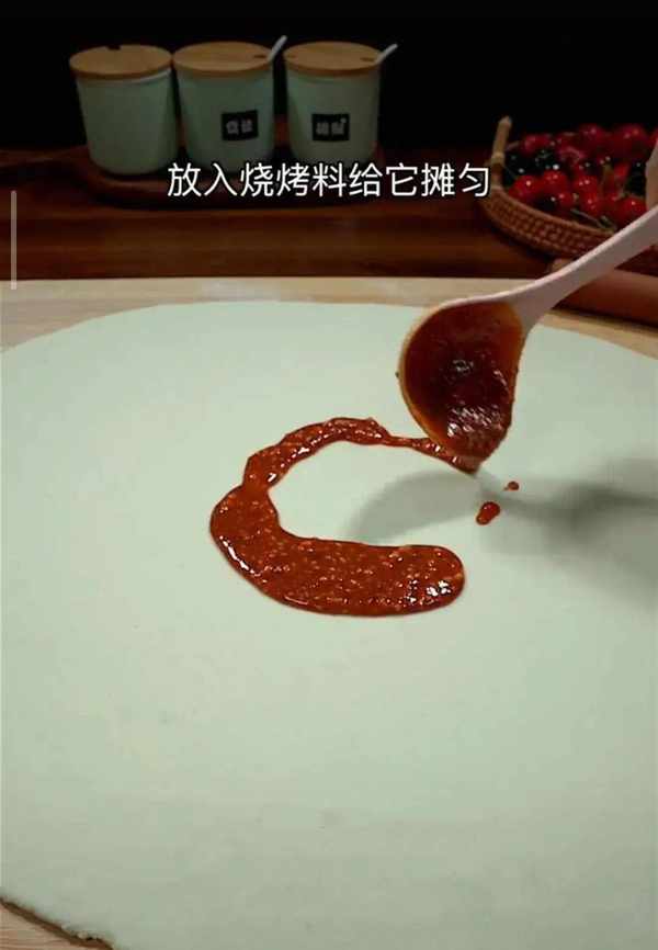 3、直接將面団搟成一個大片,放入提前做好的燒烤料給他抹勻;