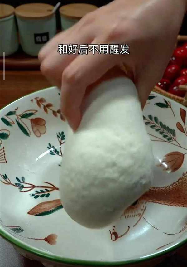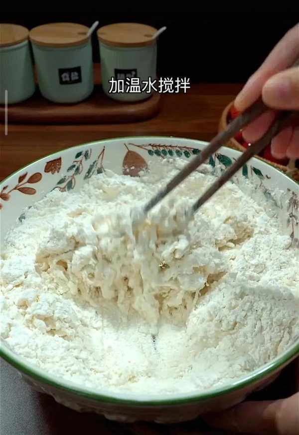 2、碗中放適量小麥自發粉,加溫水攪拌,熱水一定不能太熱,和好面之後不用醒發;