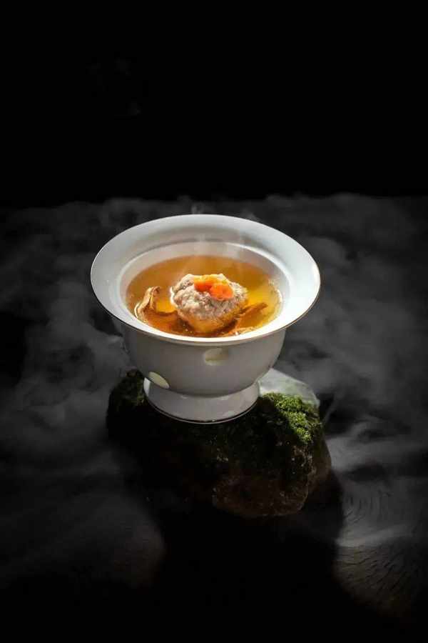 “撥霞供”源於林洪於武夷山品嘗到的“兔肉火鍋”,是中國飲食文化典籍中關於火鍋和閩南“圍爐”的最早記載之一。在本次復原中,為瞭更好地體現“撥霞供”這個名字的寓意,特此采用紅菇湯作底,燙料則包括羊肉、蝦、鮑魚、東星斑、鮑魚等,亦有取“魚羊鮮”之意。
