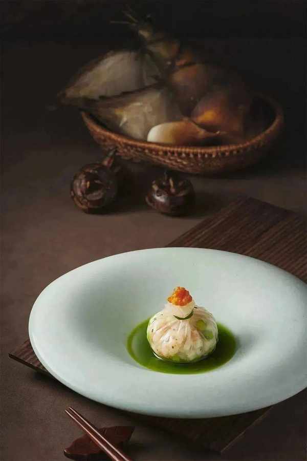 “山海兜”,取材山珍中的嫩筍與海河鮮,切後加以調味,以綠豆粉皮制作的“兜子”包起蒸制。成菜形狀意趣盎然,口感復合豐富。