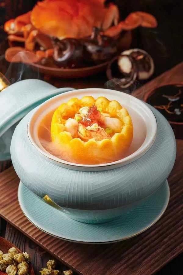 “山傢蟹釀橙”,取黃熟的大橙子,截去頂部,剜去穰。以閩南特產海蟹膏肉填充其內,將橙子頂部蓋上蒸制。