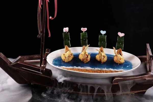 在中國烹飪文化中,蝦有“龍”之寓意,此菜肴形似昂首出海的“龍舟”,穿越風濤,龍騰四海,開拓海絲新征程,形象地展現石獅作為宋元時期的“海絲驛站”,正以蓬勃奮進的風貌,迎接“漲海聲中萬國商”的盛景。