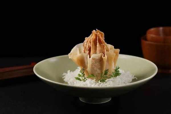 取材福建名產小黃花魚,醃制後經油炸制成金黃色船型,造型美觀精致,口感外酥內嫩,頗具有特色風味。