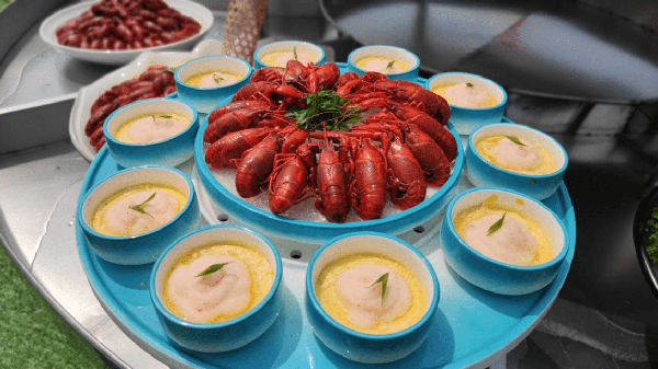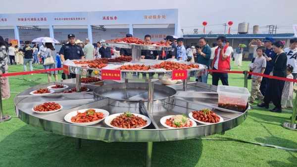 與開幕式同步進行的還有烹蝦環節,由陽新縣餐飲協會組織縣內9傢餐飲企業派出大廚現場烹飪小龍蝦。隻見在吞吐著道道火苗的鍋爐上,小龍蝦在鍋裡上下翻滾,現場頓時飄來一陣濃鬱蝦香,令人垂涎欲滴,“這隻蝦好肥,味道一定好!”各色小龍蝦菜肴已吸引一眾食客圍觀打卡 。