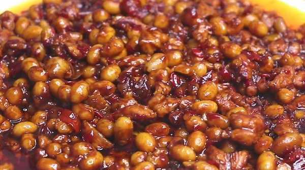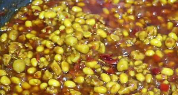 2、在慢慢的煮制過程中,黃豆裡面的水分就逐漸變少瞭,黃豆要煮到它一碾就碎的狀態。這樣就行瞭,然後將它撈到籃子裡控幹黃豆的水分。準備一些幹辣椒,大約100克,然後用清水將幹辣椒泡一下。