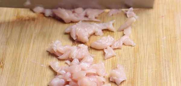 3、提前買回來的雞胸肉洗凈後切成小丁,切好後放一邊待用。準備一塊生薑,先把它切成片切絲,最後改刀成小丁後放旁邊待用。泡好的辣椒將它剁成碎末,切好的辣椒放入盤裡備用,和剛才切好的薑末放一起。