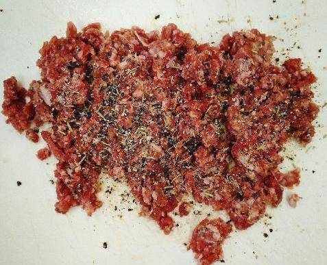 冰箱裡正好有一些牛肉餡料,原本是打算用來做餃子的,我就切出來瞭一些做漢堡,大約200克就能做兩塊漢堡瞭。再準備兩個小餐包,幾片生菜葉子。牛肉餡放到案板上,上面撒上一些海鹽,胡椒碎,香料碎,滴上幾滴橄欖油,攪拌均勻,搓成兩個大小相當的丸子狀。