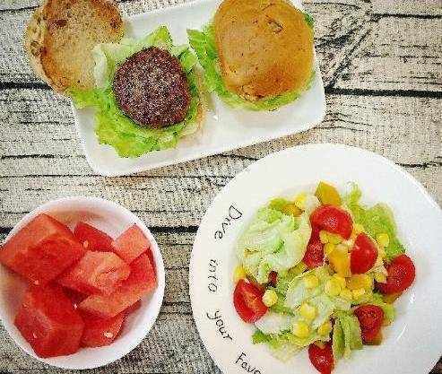 搭配上自制的蔬菜沙拉,水果,美味的一餐就做好瞭,不過最後兩個漢堡包都被兒子承包瞭,我隻吃瞭沙拉和水果,下次要多做一些瞭。