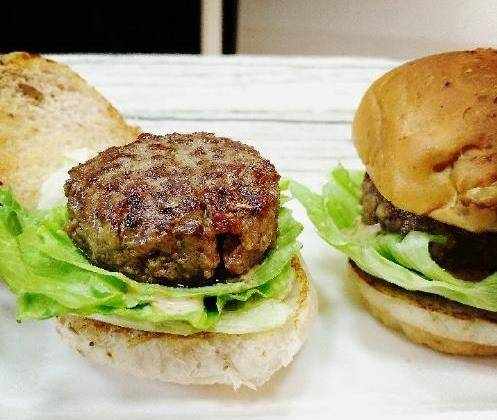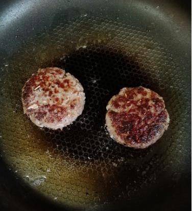 餅也加熱好瞭,肉餅也醃制的差不多瞭,炒鍋中放入足量橄欖油,然後加熱至冒煙,把肉餅放進去煎,煎肉餅要全程大火,不要頻繁翻動,每一面煎1分鐘,這樣來回翻面3次,取出來,放在廚房紙巾上靜置吸油,之後就可以放入烤好的餐包上,加上生菜沙拉醬,美味的漢堡就做好瞭,好吃又快手。