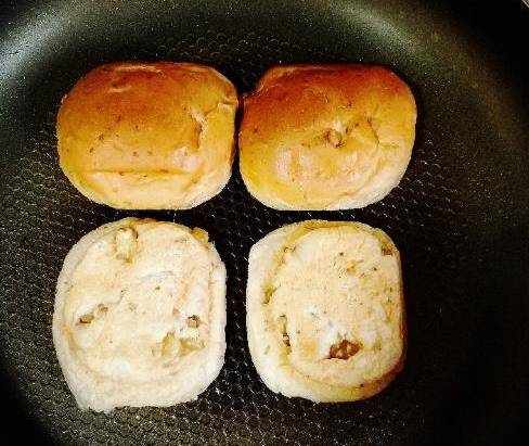 兩個丸子都完成之後,揉成圓形,按壓成兩厘米厚的肉餅,然後蓋上保鮮膜,讓調料徹底入味。然後我們把小餐包烤一下,鍋中不要加油,然後把兩個小餐包從中間橫切成兩半,放在鍋中烤到焦黃,之後取出來放在餐盤上。