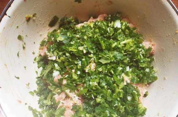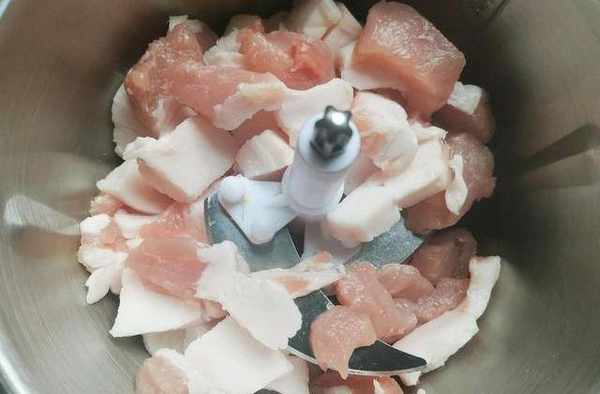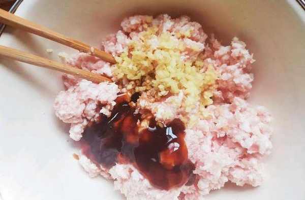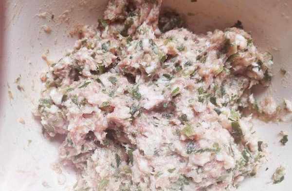 第二步、將肉切塊,放入絞肉機中打幾秒成顆粒狀,放入盆中,加鹽、老抽、蠔油、十三香、胡椒粉、薑末、順著一個方向攪拌,不要加料酒,喜歡顏色深的可以多加點老抽,再少量多次加入清水攪拌,直至攪拌至肉餡起膠,插入筷子不倒就可以瞭,最後放入大蔥、香油攪勻,也可倒入花椒油,這步很關鍵,可以鎖住肉的水分,肉餡更嫩,肉餡就調好瞭。