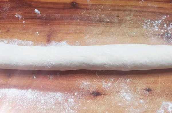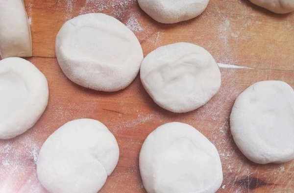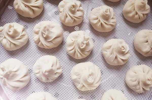 第三步、發好的面放案板上,撒上幹面粉揉面排氣,揉成長條,切成比包餃子大一點的劑子,摁扁搟成皮,包上餡,全部包好後擺入籠屜中蓋蓋醒10分鐘。