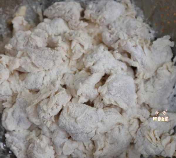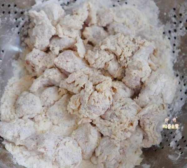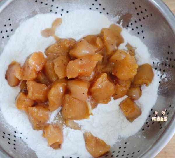 第6步、盆子裡倒入適量的面粉,把醃制好的雞塊放進去。