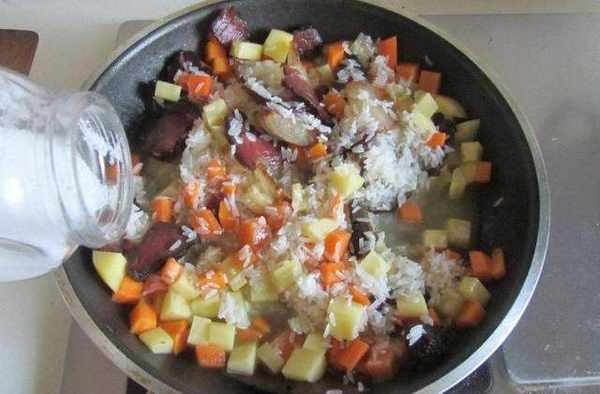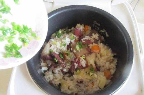 第三步:接下來,我們拿出大米放入洗米盆中,加入適量清水,把大米淘洗幹凈後,放入鍋裡開始煮。現在一般來說都是電飯鍋,所以我們可以把之前準備好的食材一起倒入鍋中,按下煮飯鍵即可。但是這裡要註意的是,米飯與水的例是1比1,如果水太多的話,會影響口感。