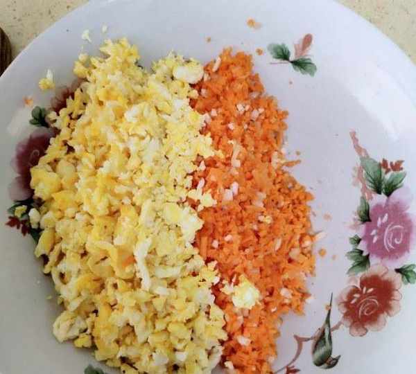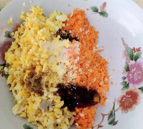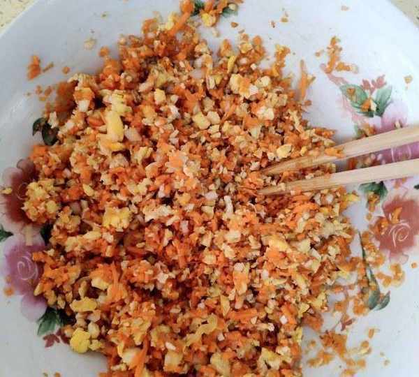 原料:胡蘿卜、雞蛋、面粉、五香粉、大蔥、老抽、食鹽、芝麻油、生薑、酵母、雞粉、蠔油、白胡椒粉。