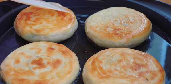 7,電餅鐺刷上一層食用油,放入餅坯小火慢烙4分鐘。