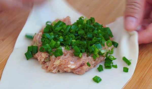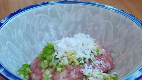 4,準備好一塊豬肉切成小塊再剁成肉餡放入碗中,打入一個雞蛋,加入蔥花,薑末,半勺玉米淀粉順著一個方向攪拌上勁。