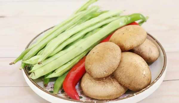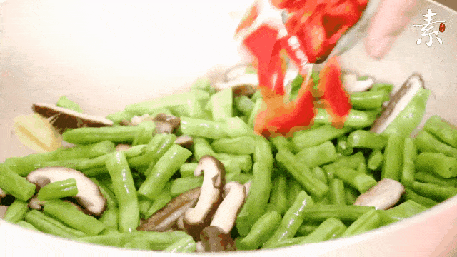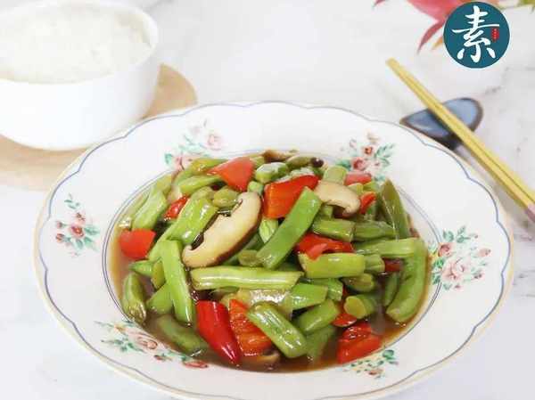 1.紅椒切小塊,四季豆切段,香菇切片。