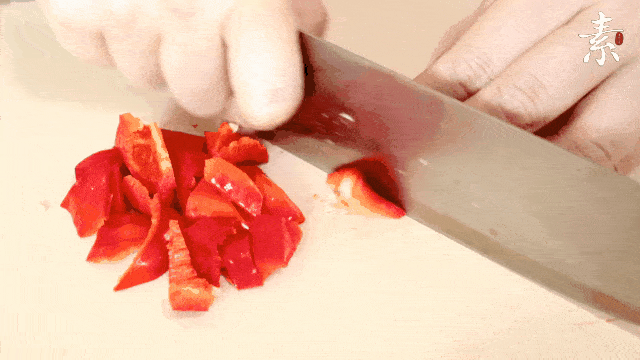 4.放入紅椒,蘑菇粉,鹽,素蠔油,翻炒入味。