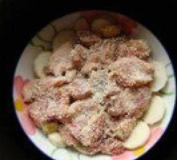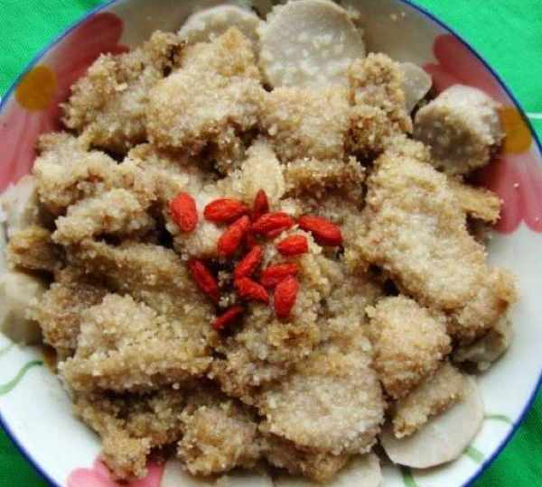 原料:五花肉、芋頭、枸杞子、自制米粉、香油、鹽、料酒、生抽、五香粉。