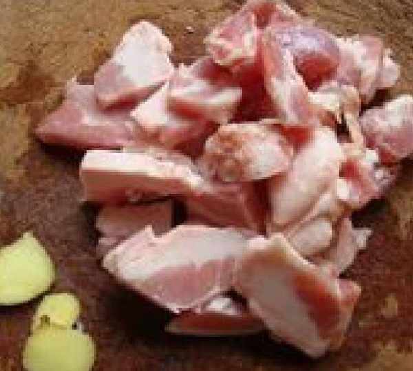 第2步、五花肉和薑放碗中,加香油、料酒、生抽、五香粉、鹽拌勻靜置半小時入味。