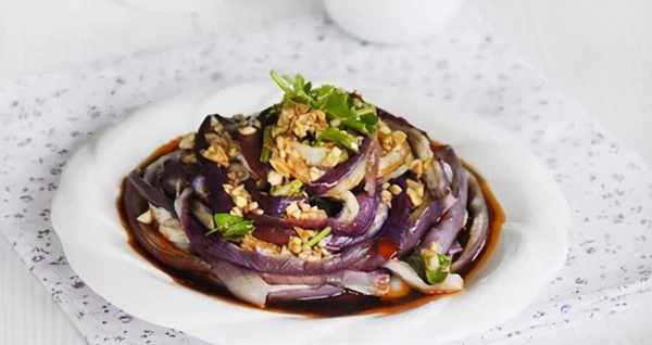 做法:將茄子洗凈,切去兩頭。鍋中放水,茄子放入蒸籠中,隔水蒸熟。蒸的這個過程中,我們可以先制作醬汁,把蒜切碎沫,然後放入醬油、香油在碗中拌勻。茄子蒸熟後撕成粗條,把調好的醬汁澆在茄子上即可食用。