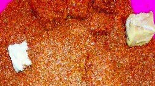 鹽巴,辣椒粉,花椒粉混合,然後把粘瞭白酒的豆腐一個一個裹上香料,要有耐心喲。