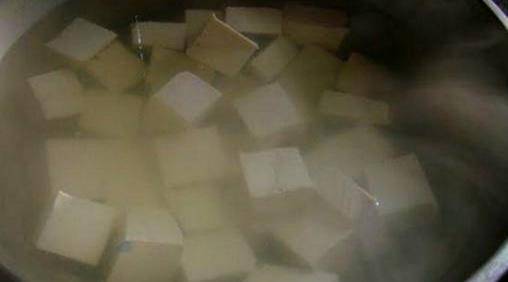 將豆腐切成小塊,先煮一會,防止太軟而碎掉。