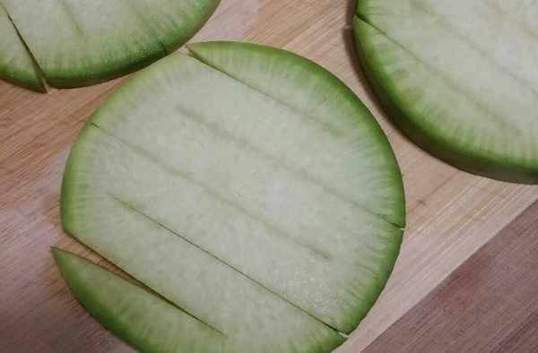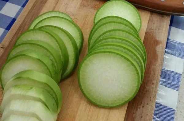 第一步: 大傢記住蘿卜一定要買綠皮的,醃出來的蘿卜幹比較好吃。將蘿卜洗凈,去掉頭尾,切成大概一厘米厚的圓片。