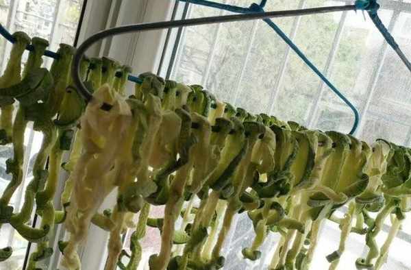 第三步: 把醃瞭一夜出過水的蘿卜條掛在衣架上,放在暖氣邊晾一天一夜就可以瞭。晾好的狀態如圖所示,這個幹濕度是最好的,吃起來嘎嘣脆。再幹一點就有點嚼不動瞭,口感也不好。