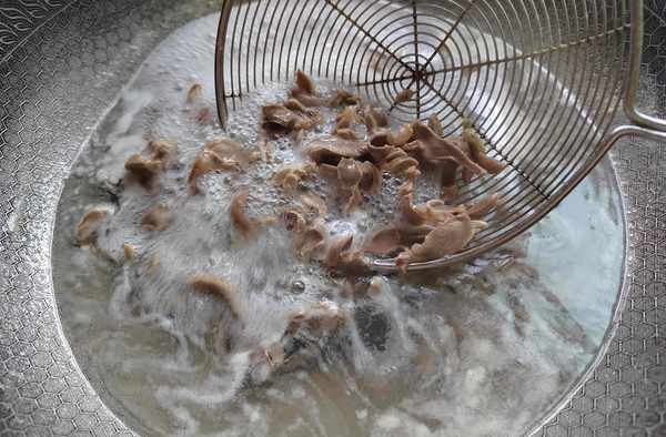 第五步:把洗幹凈的雞胗,切成薄片,冷水入鍋,加入剩餘的料酒,大火煮開後,撇掉浮沫,再煮1分鐘。