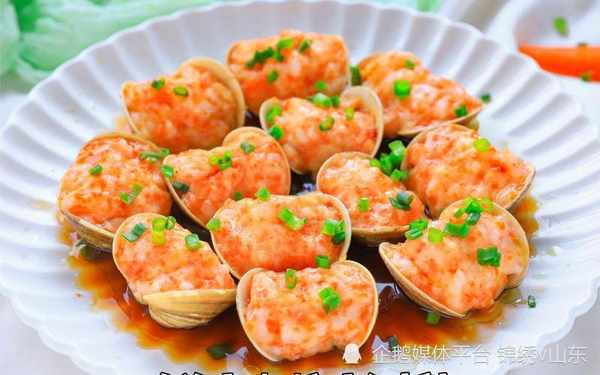 (5)將蝦泥依次塞入蛤蜊中,均勻地擺入盤中,再放入蒸鍋中,蒸至熟透,關火,打開鍋蓋,端出來,再均勻淋入調好的料汁。