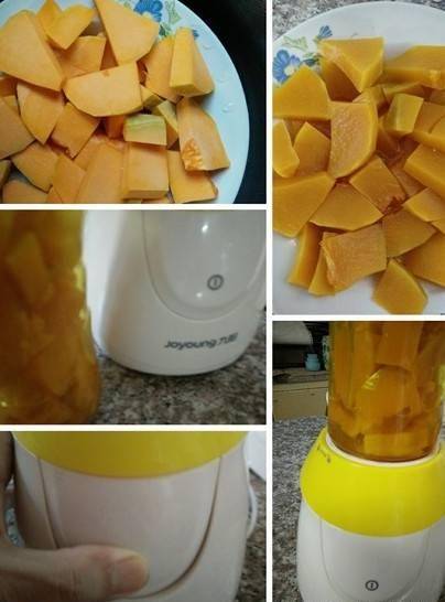 3.將蒸好的南瓜和面糊倒入榨汁機或攪拌機中攪拌至順滑!如果傢裡沒有攪拌機,可以把蒸好的南瓜打成泥,然後拌入面條中。南瓜蒸熟後,很容易搗爛!