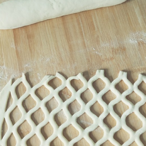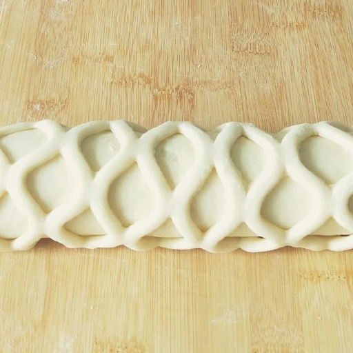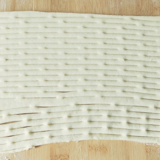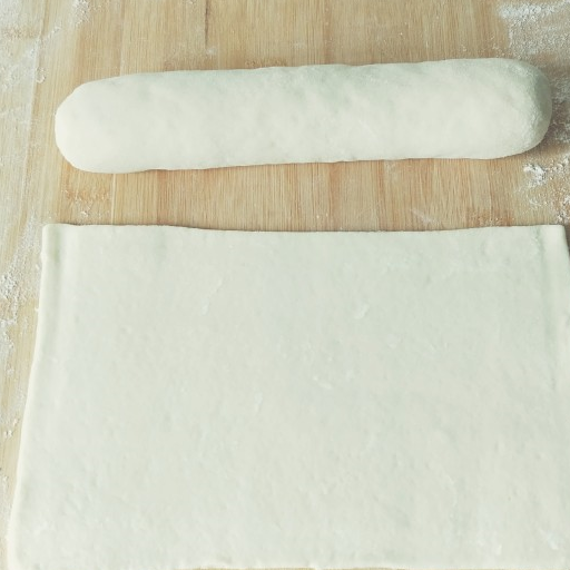 第8步、將面團一塊用來搓成條狀,另一面團搟成薄厚均勻的面皮去其四邊。