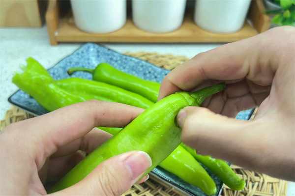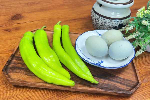 所需食材:青椒四個、皮蛋兩個、小米椒、蒜、小蔥、香醋、生抽、香油、鹽、糖