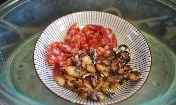 3.將廣式香腸和培根切成薄片,放入蒸鍋蒸10分鐘。
