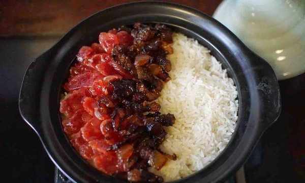 8、米飯煮熟後加入紅燒臘肉和香腸,蓋上鍋蓋。