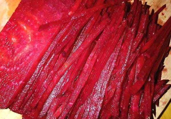 之後我們就可以做飯瞭。首先,將食用油倒入鍋中。當油的溫度達到所需值時,將大蒜放入鍋中。用小火烤蔬菜後,加入甜菜並與香料快速混合。不停的攪拌,我們等到食材炒熟,生的時候,加入鹽和雞精,調味後,就可以出鍋瞭。