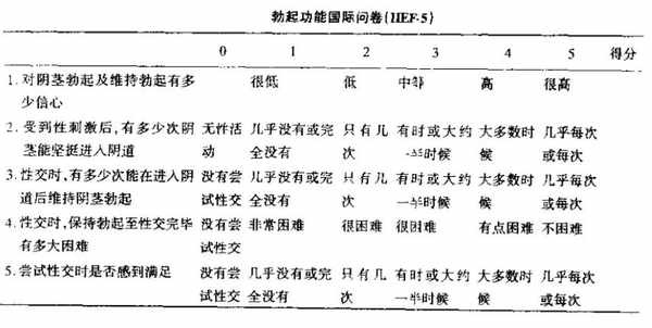 國際勃·起功能問卷-5(IIEF-5)將男性功能障礙程度分為輕度IIEF-5、中度IIEF-5和重度IIEF-5。其中,評分12~21分為輕度IIEF-5,評分8~11分為中度IIEF-5,評分5~7分為重度IIEF-5。