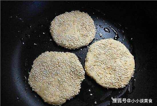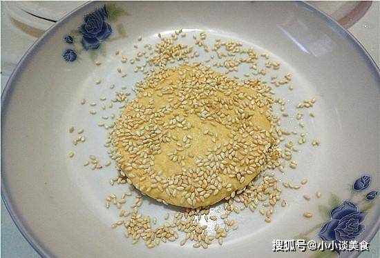 5、取一個丸子大小的面團,揉成圓形,然後稍微壓扁,兩面粘上芝麻。煎餅越厚,烤的時間越長,煎餅越薄,烤的時間越短。