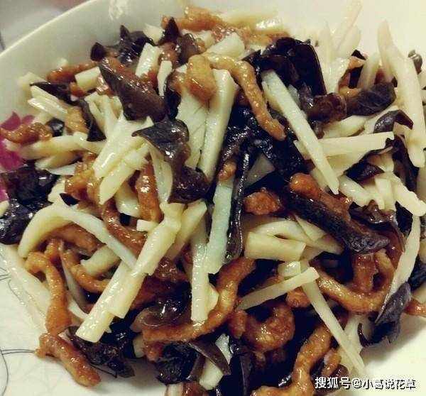 3、鍋燒熱,撈出適量油,加入薑絲和筍絲一起炒,炒的時候加適量水,防止冬筍幹透。待冬筍變色後,加入香菇絲加適量鹽攪拌均勻,再倒入適量清水,將冬筍炒軟爛透。最後放入肉絲和韭菜,並加入適量的雞精,翻炒均勻,韭菜碎瞭,就可以起鍋瞭。