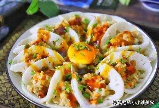 6.取一片涼透的藕片,放上肉餡,裝盤,中間放一個蛋黃。