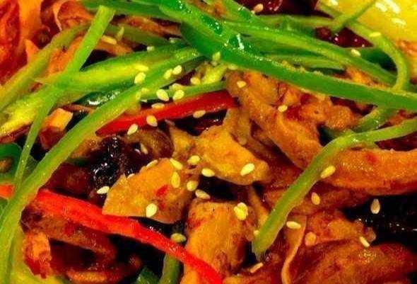 1.將煮熟的五花肉撕開;將杭椒和紅椒磨碎