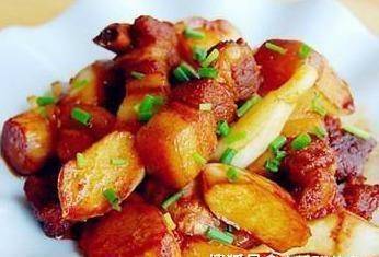 材料:五花肉、茭白、蔥、薑、八角、料酒、老抽、糖、鹽