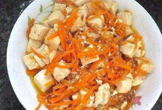 原料:豆腐250克、胡蘿卜50克、植物油、精鹽、味精、醬油、水淀粉、蔥花、蒜片。
