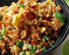 2攪拌均勻。倒入米飯拌勻。加入切丁的青椒拌勻。最後加入雞精調味,關火,出鍋即可食用。