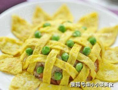 3將煎蛋放在案板上,切成細條,用煎蛋的邊緣切掉尖角(圖6)。鍋內倒入油,燒熱至70%,加入胡蘿卜丁、香菇丁、火腿丁,翻炒2分鐘,加入米用勺子壓一下,繼續翻炒至米粒變色。幹燥而富有彈性。加鹽拌勻。把炒好的米飯放在碗裡,倒扣在盤子裡,然後用蛋絲在米飯上編辮子,最後把葉子放在盤子的邊緣,最後把焯過水的豌豆放在上面就好瞭點。到網絡。紅燒豬尾