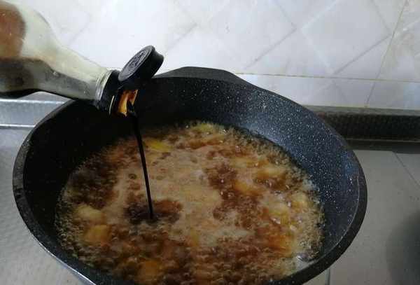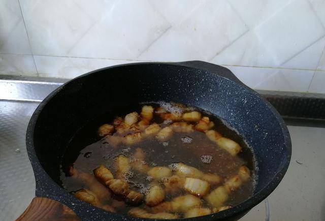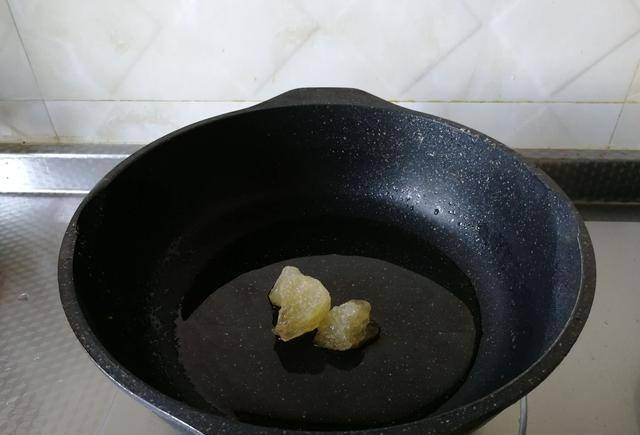 3、不粘鍋一個。倒入玉米油。放入老冰糖。開中小火,慢慢倒入老冰糖攪拌至融化。煎至琥珀色。